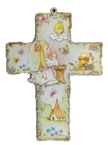 Croix avec image collée sur bois d'une petite fille faisant sa première communion.