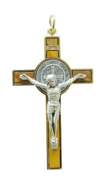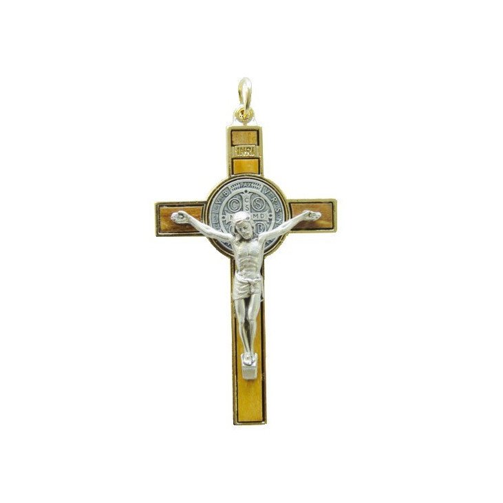 Croix à suspendre de Saint Benoit en métal doré et en bois d'olivier.