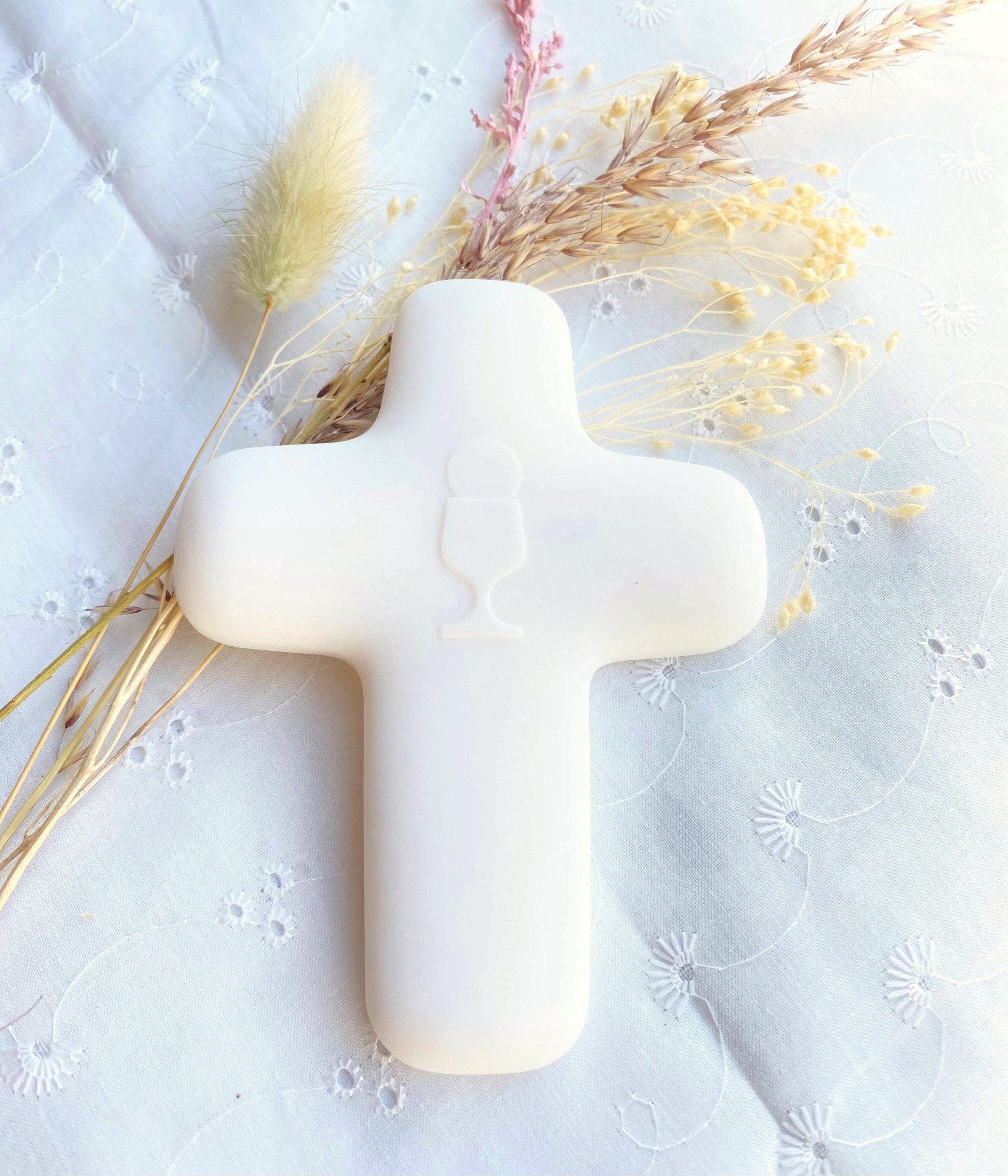 L’Eucharistie est au cœur de la foi chrétienne, rappelant le don de Jésus-Christ à travers son corps et son sang. Cette croix, avec ses lignes pures et son matériau lumineux et élégant, sera un cadeau chargé de sens et de spiritualité, qui trouvera facilement sa place dans la maison, que ce soit dans un coin prière ou un petit oratoire, ou dans une chambre d'enfant ou d'adulte. Une fixation discrète au dos de la croix permet de l'accrocher au mur.