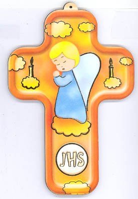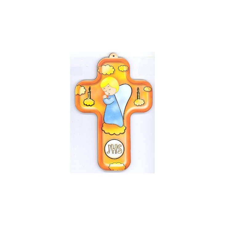 C'est une croix en bois léger, avec une image imprimée. L'image représente sur un fond jaune orangé un petit ange à la robe bleue, les mains jointes, en prière. Il est encadré par le dessin de deux bougies allumées.