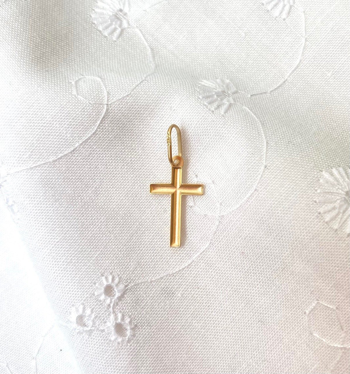 Voici une petite croix toute légère en or 18 carats, mesurant 13 mm, dont le dos est creux.