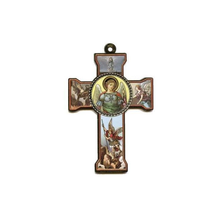 Cette croix est en bois compressé et l'image représentant Saint Michel est une image redorée et collée sur bois.