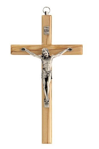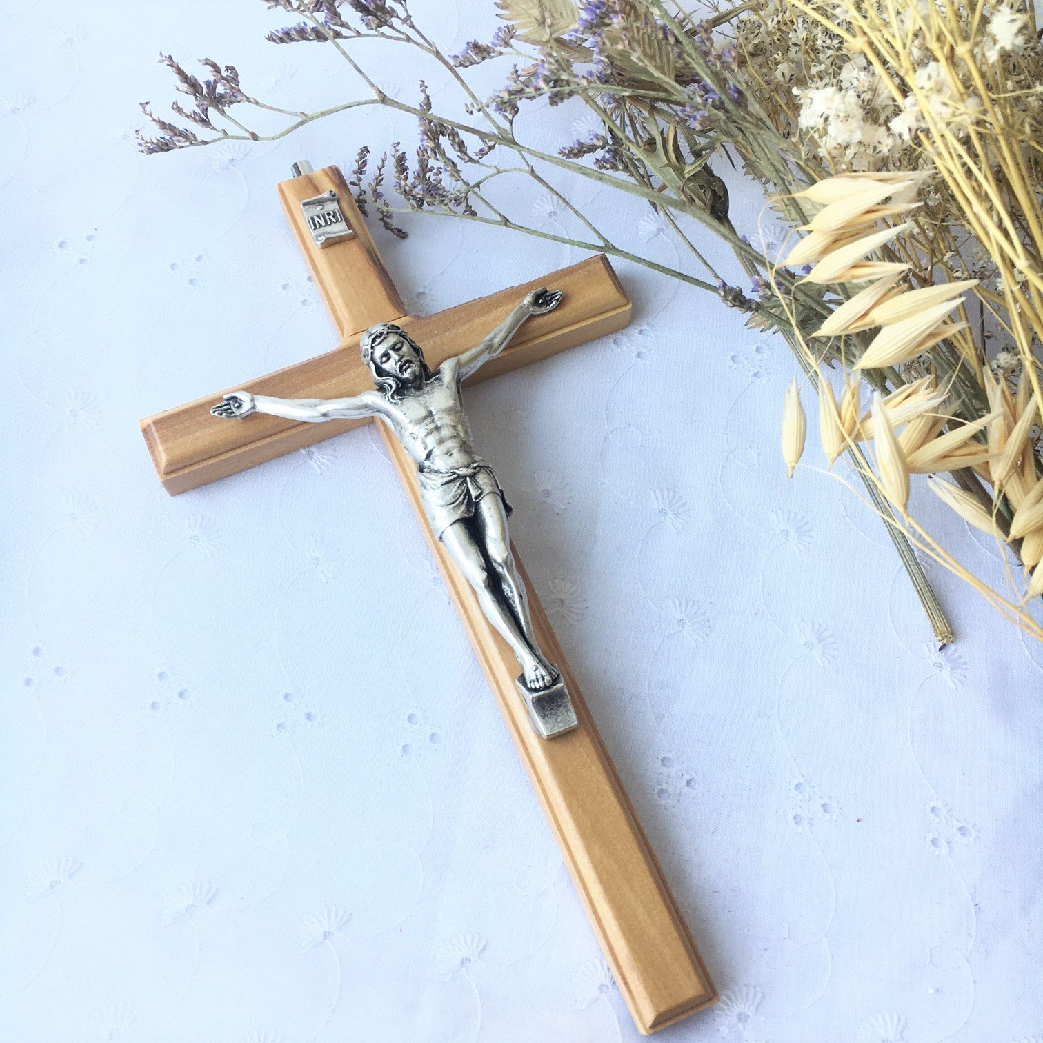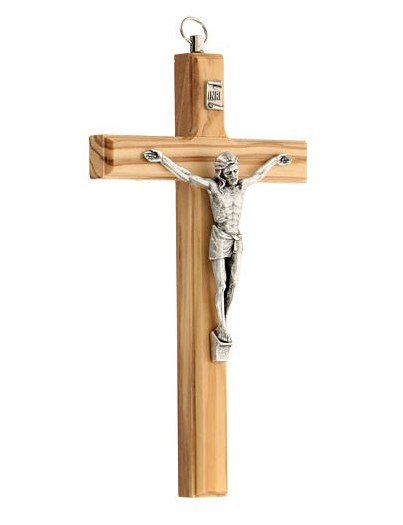 Cette croix classique est en bois d'olivier clair et vernis, aux bords biseautés, sur lequel est fixé un Christ en métal argenté. Vous pouvez choisir la taille qui vous convient le mieux : une petite taille comme 7.5 cm, pour porter sur une aube de servant d'autel, ou comme croix de profession de foi, ou plus grande pour orner votre coin prière ou votre maison, ou encore votre oratoire.