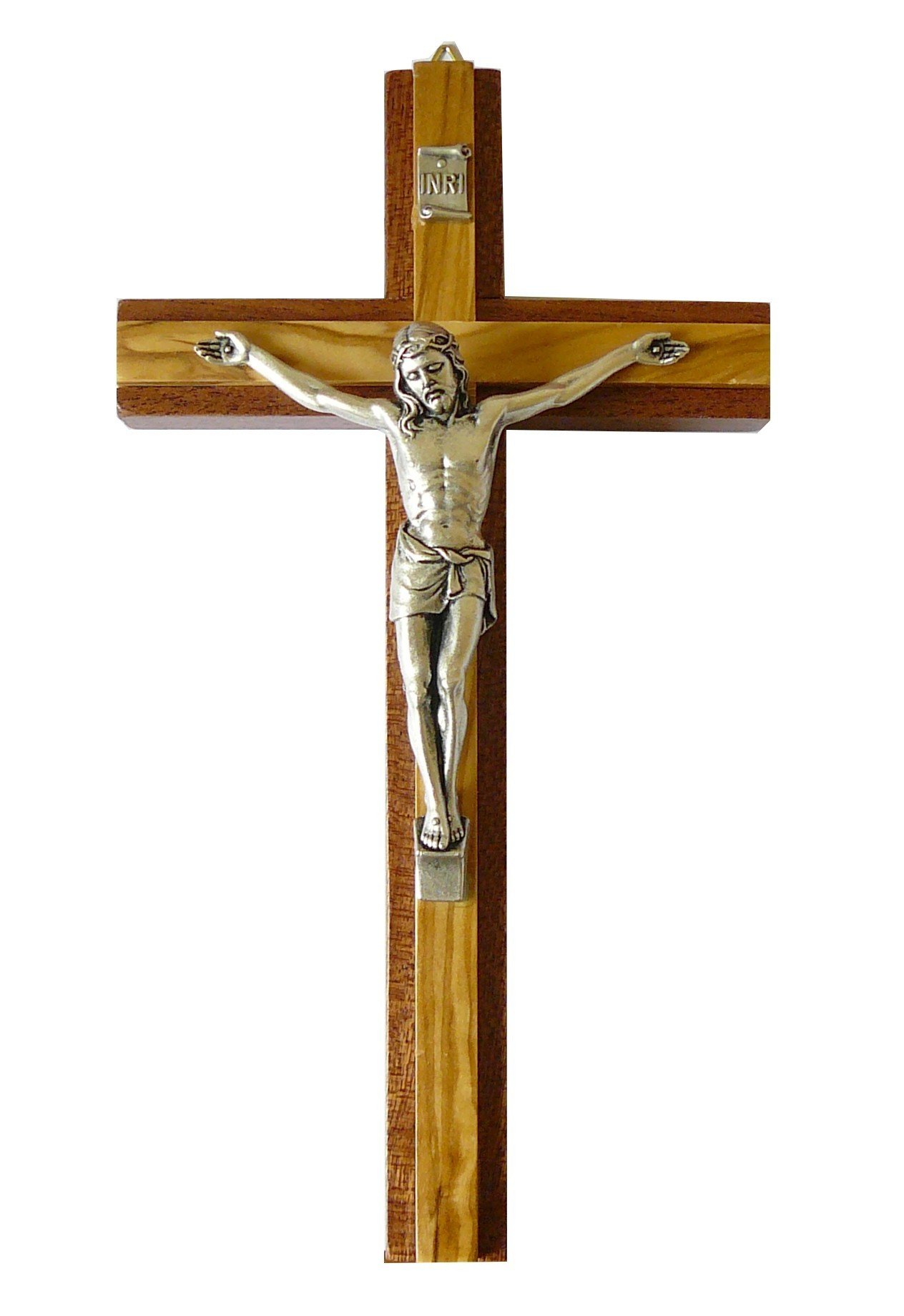 Crucifix en bois d'olivier et en bois exotique avec le Christ en métal argenté.
