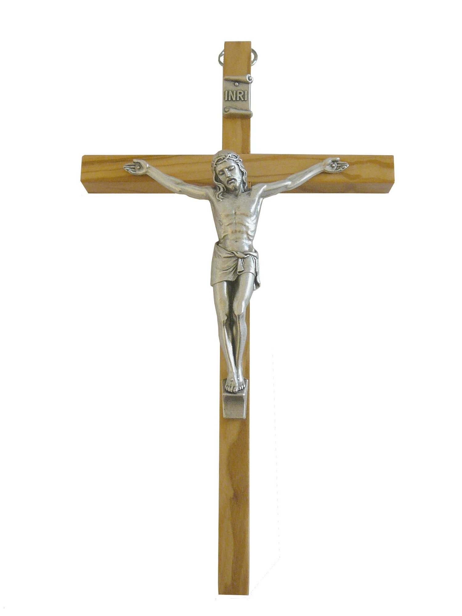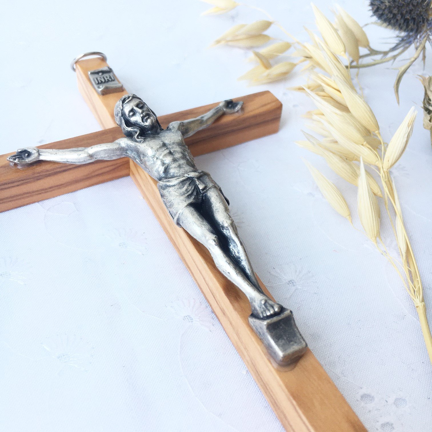 Crucifix en bois d'olivier à branches carrées non biseautées avec le Christ en métal argenté.