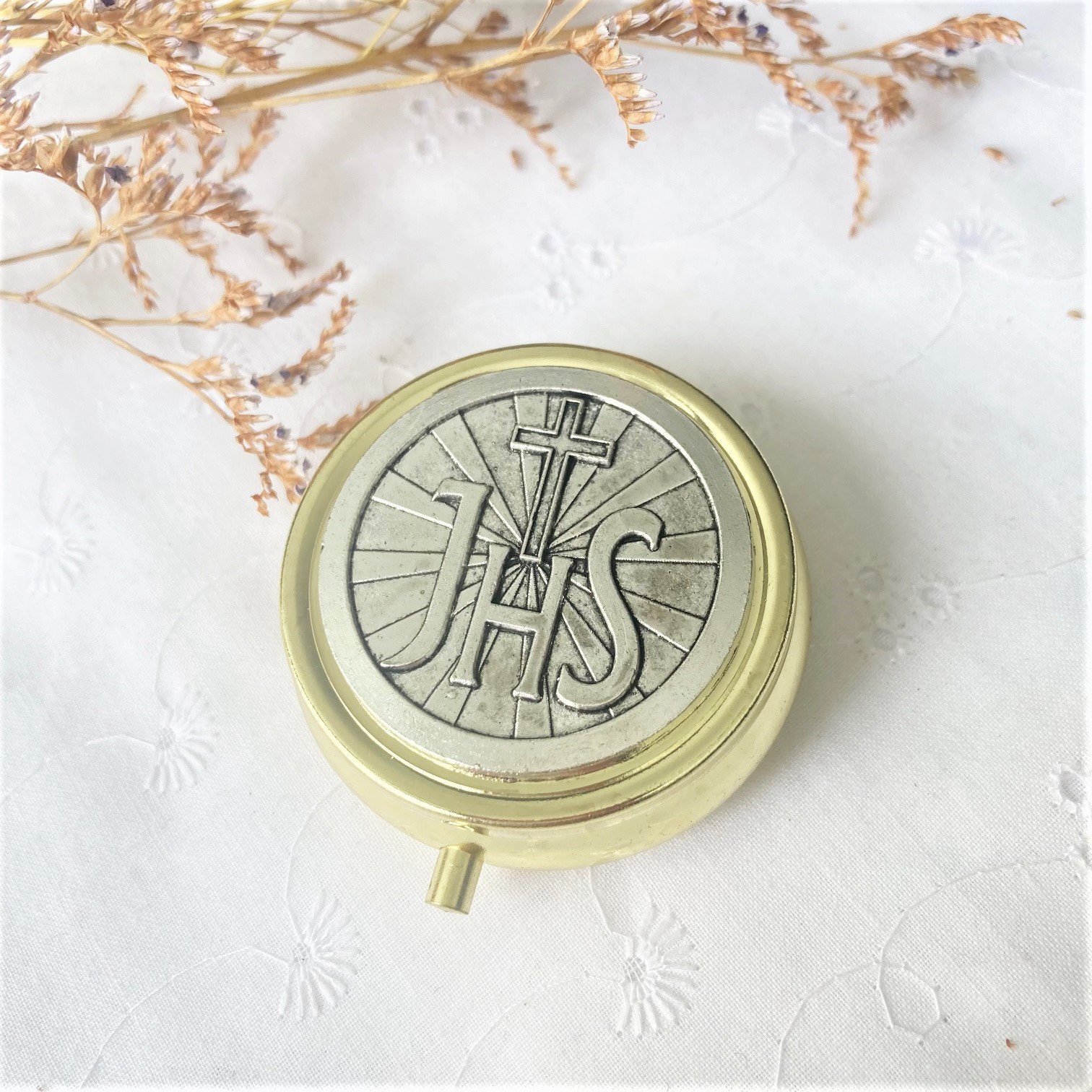 Adoptez cette belle custode dorée et argentée gravée JHS avec la croix.