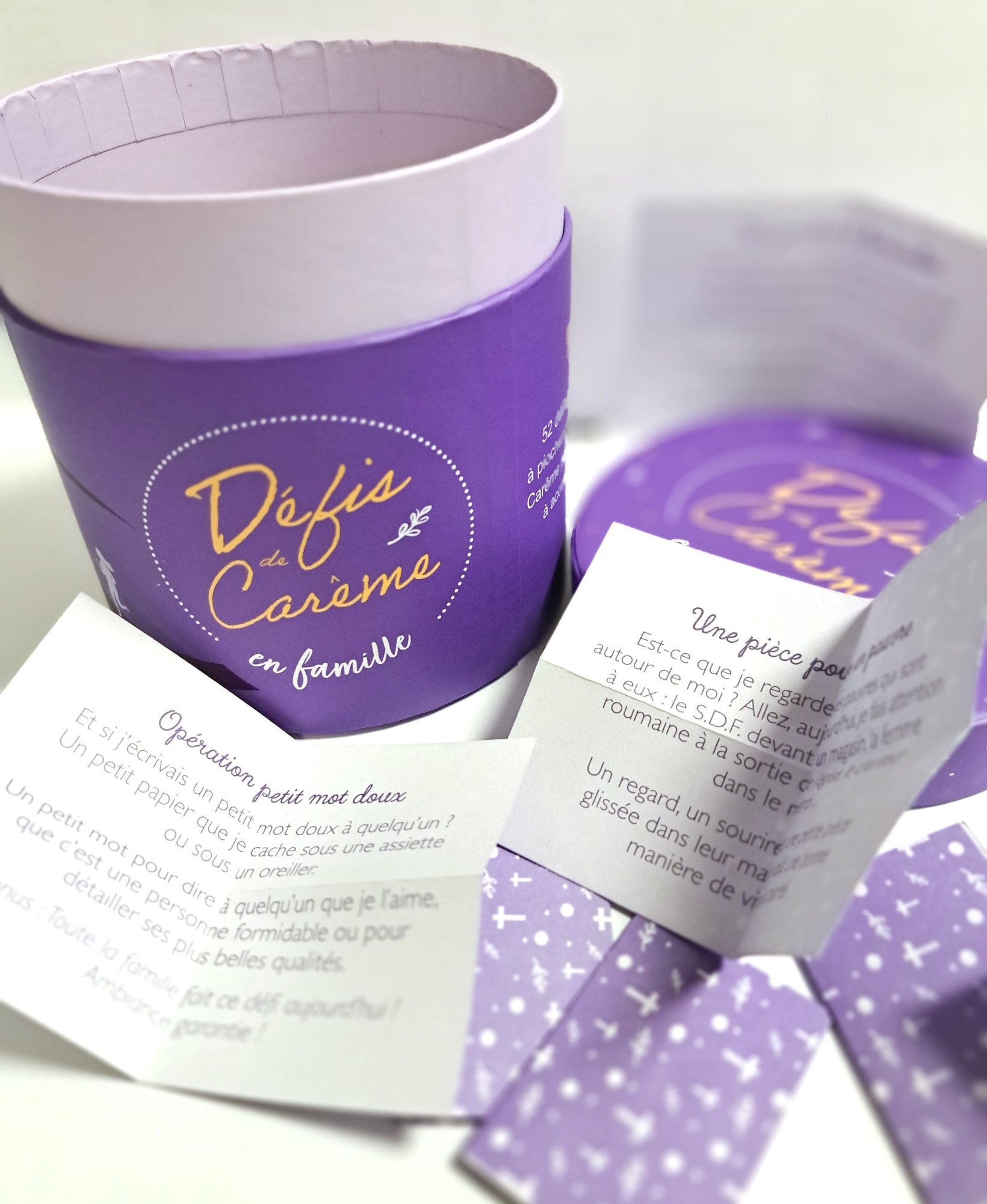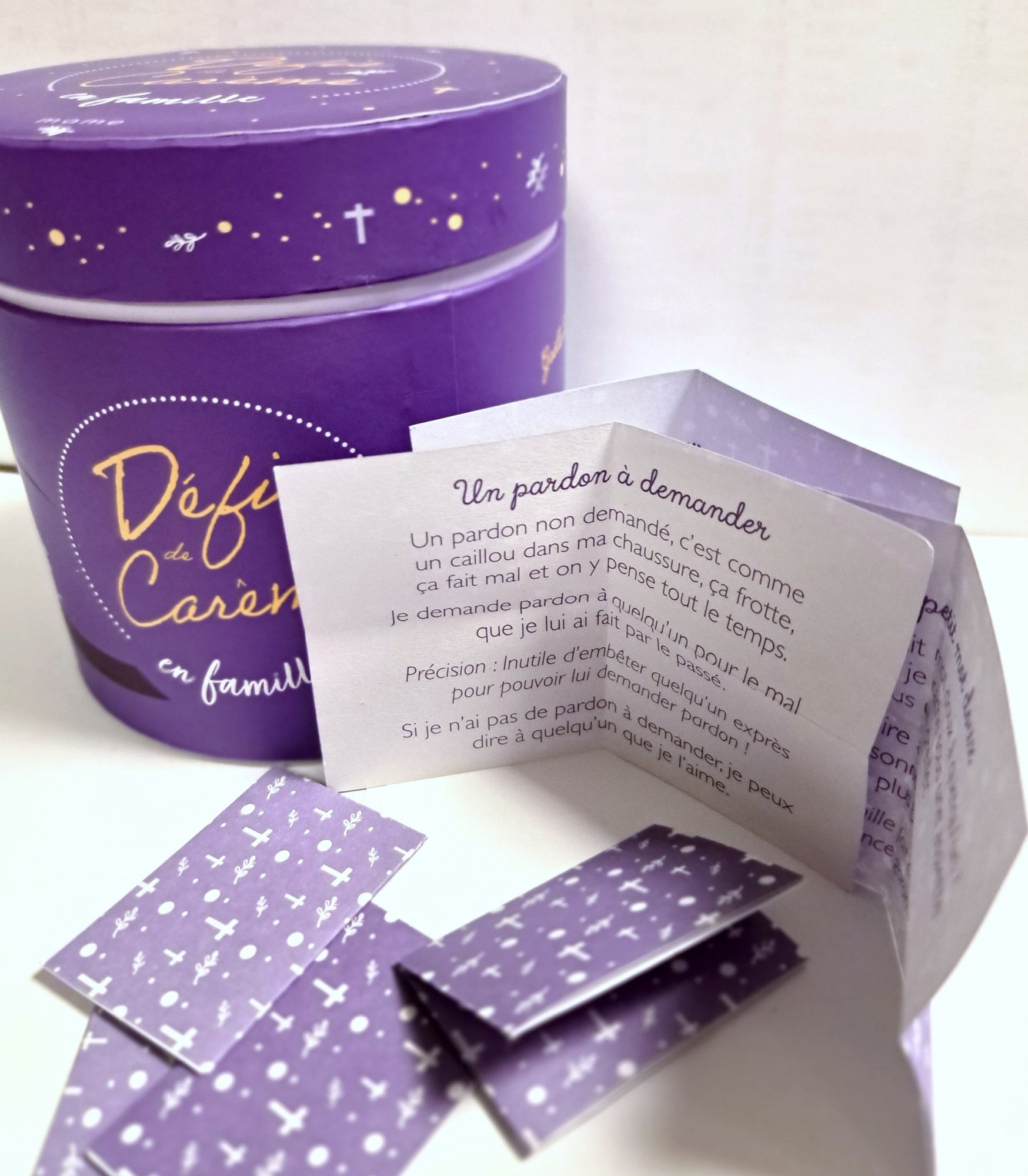 Cette boîte "Défis de Carême en famille" sera une véritable aide quotidienne pour que la prière, le service, et la pénitence aide chacun à grandir dans la foi.