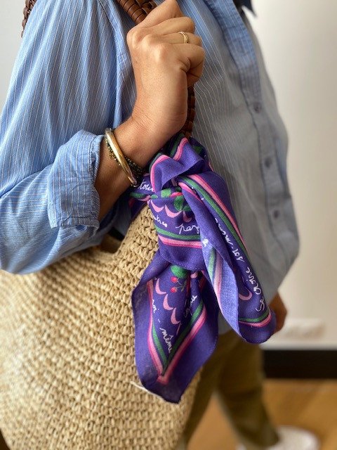 Ce petit foulard Vivre d'Amour Violet de 50 x 50 cm, aux teintes vives sur fond violet profond, convient aussi bien aux jeunes filles qu’aux femmes. Une belle idée de cadeau à offrir à une fille, une nièce ou une filleule, pour marquer une étape de foi ou simplement pour faire plaisir avec un accessoire mode et inspiré !