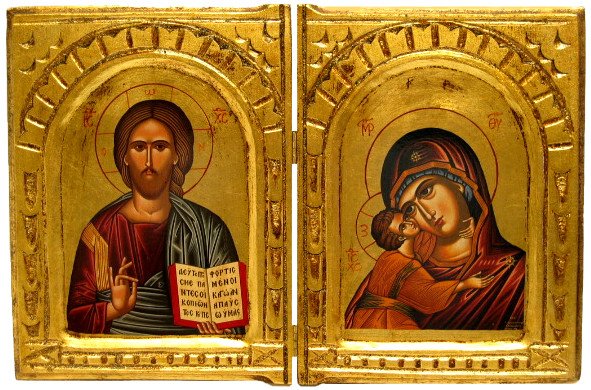 Cette icône " Bible " s'ouvre tel un livre et représente la Vierge de Korsun accompagnée du Christ Pantocrator. C'est une icône traditionnelle byzantine imprimée sur deux petits canevas reliés entre eux qui ont par la suite été dorés à l'aide de feuilles d'or pour une qualité supérieure, le tout entouré de cadres magnifiquement sculptés. Ce travail est réalisé à la main de manière artisanale, c'est pourquoi les dessins sont susceptibles d'être légèrement modifiés selon les modèles.
