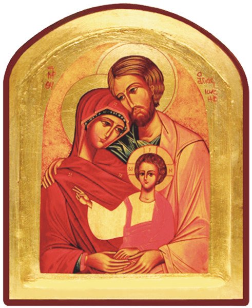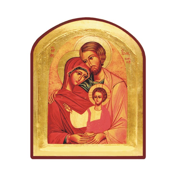 Découvrez cette magnifique icône creuse arrondie représentant la Sainte Famille. C'est une icône traditionnelle dont l'image a été imprimée sur un petit canevas qui a par la suite été doré à la feuille d'or. L'impression de l'image sur le canevas et les dorures ont été réalisées à la main, pour vous offrir un maximum de qualité et de résistance au temps. L'icône ayant été faite à la main de manière artisanale, les dessins sont donc susceptibles de varier d'un modèle à l'autre. Cette icône est disponible en plusieurs dimensions :