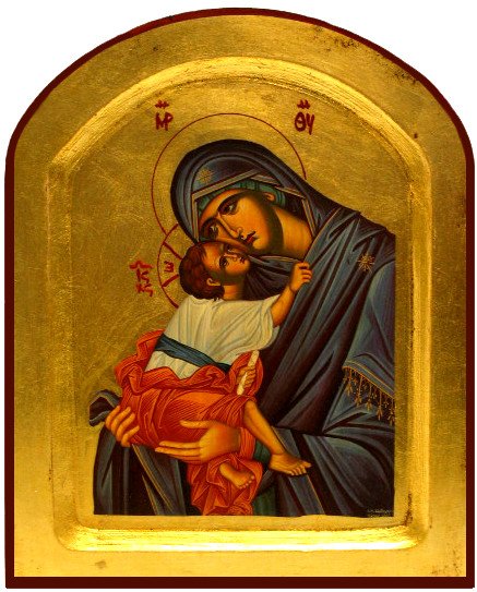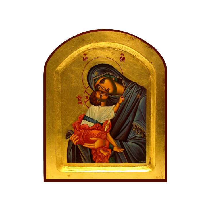 Cette icône représente la Vierge de Tendresse parée d'un voile bleu. C'est une icône traditionnelle byzantine creuse arrondie imprimée sur un petit canevas qui a par la suite été doré à l'aide de feuilles d'or pour une qualité supérieure. Ce travail a été réalisé à la main de manière artisanale, c'est pourquoi les dessins sont susceptibles d'être légèrement modifiés selon les modèles.