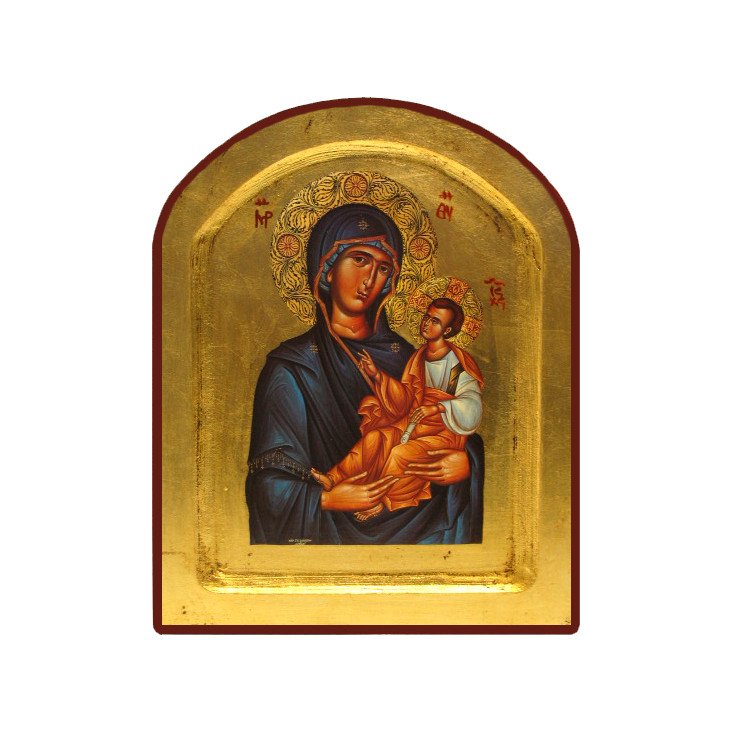 Cette icône représente la Vierge Toute Puissante accompagnée de l'Enfant Jésus. C'est une icône traditionnelle byzantine creuse arrondie imprimée sur un petit canevas qui a par la suite été doré à l'aide de feuilles d'or pour une qualité supérieure. Ce travail a été réalisé à la main de manière artisanale, c'est pourquoi les dessins sont susceptibles d'être légèrement modifiés selon les modèles. Ses dimensions sont les suivantes : 12 x 17 cm