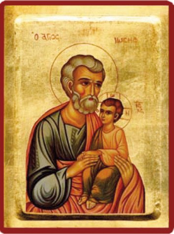 Cette icône byzantine est à l'effigie de Saint Joseph et de l'Enfant Jésus. Elle a été fabriquée à la main de manière artisanale. Elle figure sur un petit canevas imprimé, qui a été doré avec des feuilles d'or. Les modèles peuvent varier, l'image peut ne pas être exactement la même.