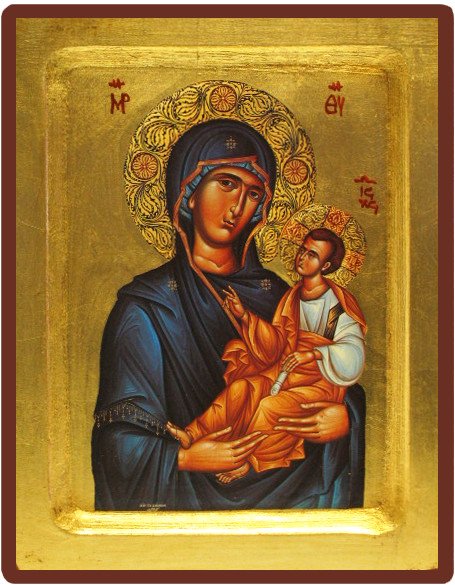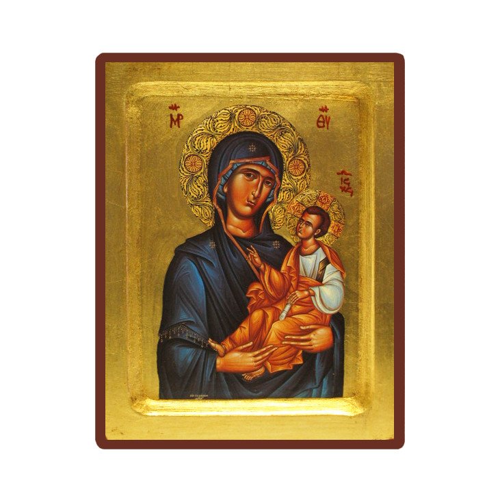 Cette icône représente la Vierge Toute Puissante accompagnée de l'Enfant Jésus. C'est une icône traditionnelle byzantine creuse imprimée sur un petit canevas qui a par la suite été doré à l'aide de feuilles d'or pour une qualité supérieure. Ce travail a été réalisé à la main de manière artisanale, c'est pourquoi les dessins sont susceptibles d'être légèrement modifiés selon les modèles. Ses dimensions sont les suivantes : 18 x 23 cm