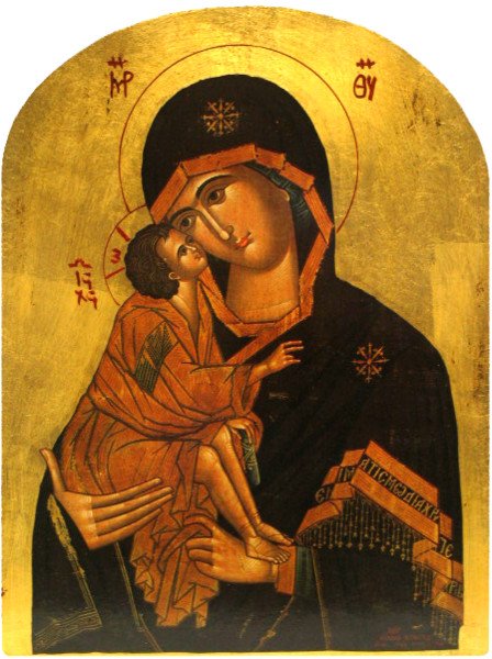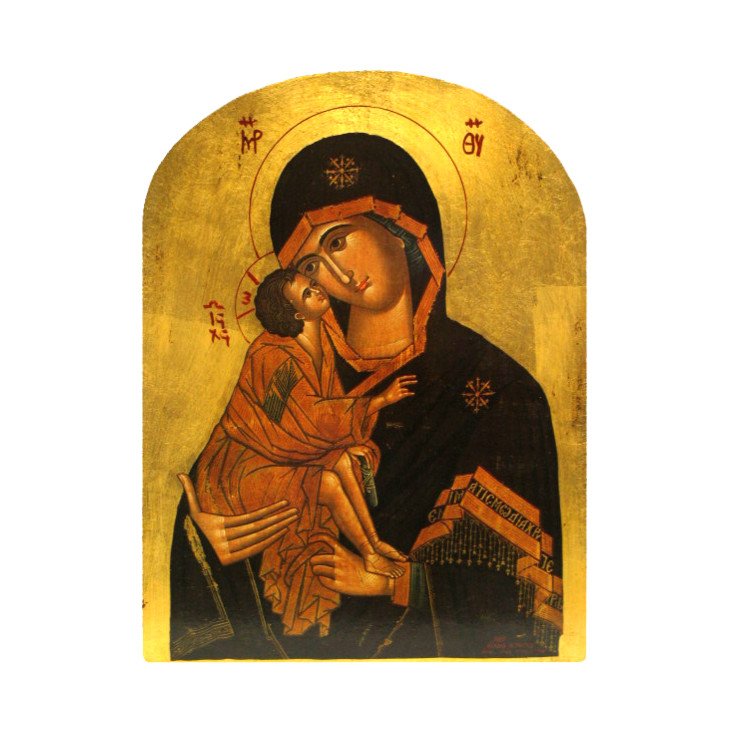 Voici une élégante icône traditionnelle arrondie représentant la Vierge de Vladimir. C'est une icône traditionnelle byzantine imprimée sur un petit canevas qui a par la suite été doré à la feuille d'or pour une qualité supérieure. Ce travail est réalisé à la main de manière artisanale, c'est pourquoi les dessins sont susceptibles d'être légèrement différents les uns des autres.