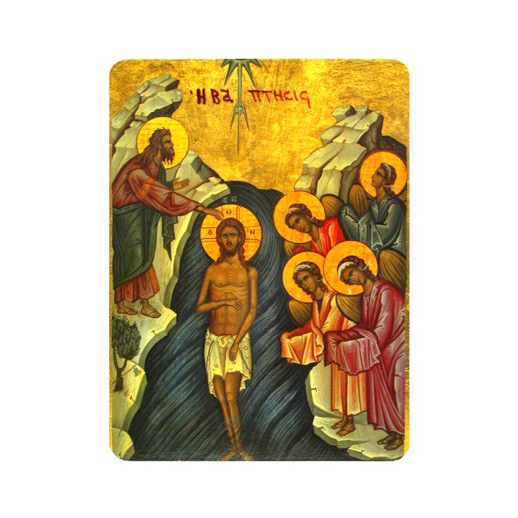 Découvrez cette magnifique icône plate représentant la scène du Baptême du Christ. C'est une icône traditionnelle plate dont l'image a été imprimée sur un petit canevas qui a par la suite été doré à la feuille d'or. L'impression de l'image sur le canevas et les dorures ont été réalisées à la main, pour vous offrir un maximum de qualité et de résistance au temps. L'icône ayant été faite à la main de manière artisanale, les dessins sont donc susceptibles de varier d'un modèle à l'autre.Cette icône plate est disponible en plusieurs dimensions : 10 x 14 cm et 13 x 20 cm.