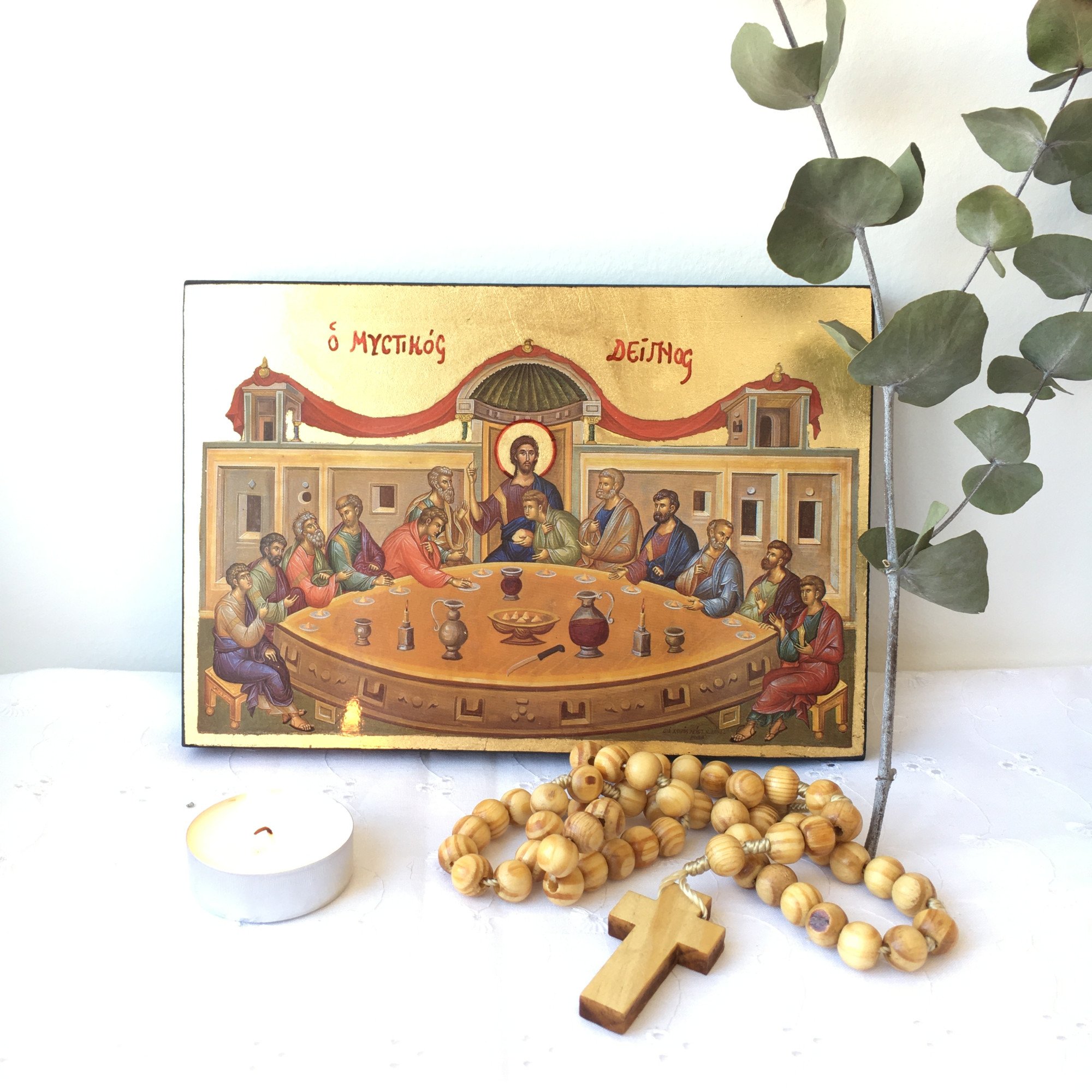 Cette icône représente la Sainte Cène, le dernier repas du Christ en compagnie de ses 12 apôtres le Jeudi Saint. C'est une icône byzantine traditionnelle imprimée sur un petit canevas qui a été doré avec des feuilles d'or, elle est plate. Elle a été fabriquée à la main de manière artisanale. Les modèles peuvent varier, l'image peut ne pas être exactement la même. Ses dimensions sont les suivantes :