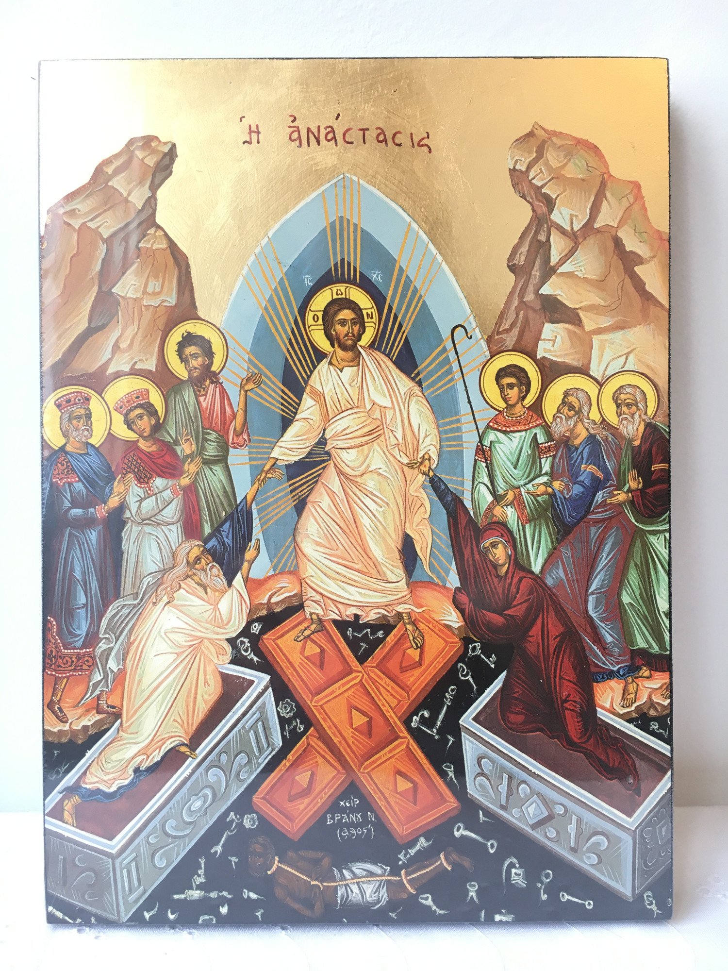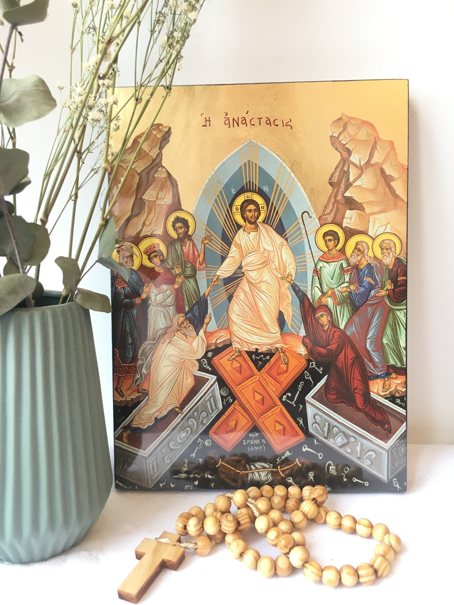Découvrez cette magnifique icône plate représentant la scène de la Résurrection : quand le Christ est revenu d'entre les morts après la Crucifixion. C'est une icône traditionnelle plate dont l'image a été imprimée sur un petit canevas qui a par la suite été doré à la feuille d'or. L'impression de l'image sur le canevas et les dorures ont été réalisées à la main, pour vous offrir un maximum de qualité et de résistance au temps. L'icône ayant été faite à la main de manière artisanale, les dessins sont donc susceptibles de varier d'un modèle à l'autre.Cette icône plate est disponible en plusieurs dimensions :