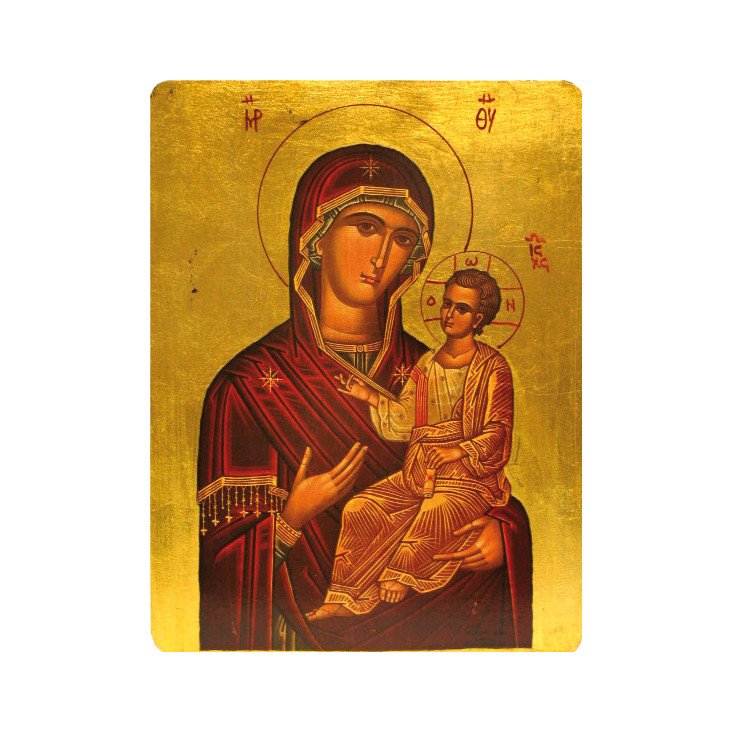 Cette icône représente la Vierge Marie, Porte du Ciel, dans la plus pure tradition byzantine. Imprimée sur un petit canevas, elle est ensuite sublimée à la main par l'application de feuilles d'or, offrant ainsi une finition raffinée et de haute qualité. Chaque pièce étant réalisée de manière artisanale, de légères variations peuvent apparaître d’un modèle à l’autre, rendant chaque icône unique.