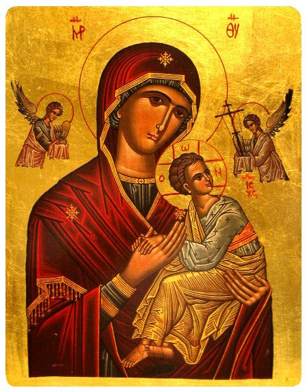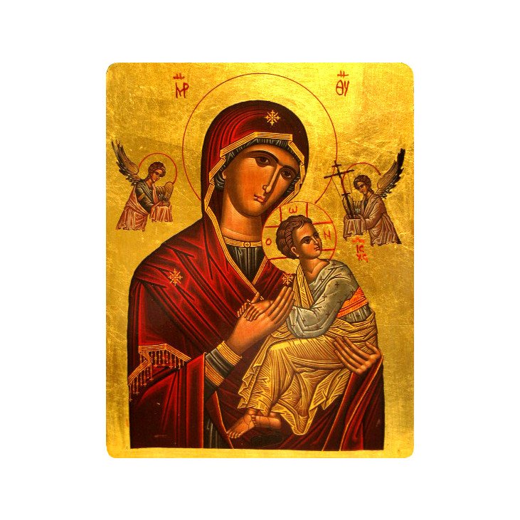 Cette icône byzantine plate est à l'effigie de Notre-Dame de Perpétuel Secours. Elle a été fabriquée à la main de manière artisanale. Elle figure sur un petit canevas imprimé, qui a été doré avec des feuilles d'or. Les modèles peuvent varier, l'image peut ne pas être exactement la même. Plusieurs dimensions sont disponibles :