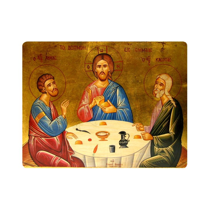Découvrez cette magnifique icône plate représentant la scène du Repas d'Emmaüs. C'est une icône traditionnelle plate dont l'image a été imprimée sur un petit canevas qui a par la suite été doré à la feuille d'or. L'impression de l'image sur le canevas et les dorures ont été réalisées à la main, pour vous offrir un maximum de qualité et de résistance au temps. L'icône ayant été faite à la main de manière artisanale, les dessins sont donc susceptibles de varier d'un modèle à l'autre. Cette icône plate mesure 32 x 42 centimètres.