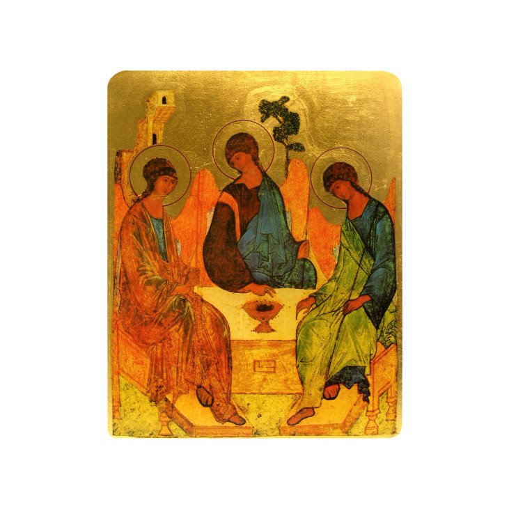 Découvrez cette magnifique icône plate représentant la Sainte Trinité peinte par Roublev, moine et peintre d'icônes russe du XV siècle. C'est une icône traditionnelle russe dont l'image a été imprimée sur un petit canevas qui a par la suite été doré à la feuille d'or. L'impression de l'image sur le canevas et les dorures ont été réalisées à la main, pour vous offrir un maximum de qualité et de résistance au temps. L'icône ayant été faite à la main de manière artisanale, les dessins sont donc susceptibles de varier d'un modèle à l'autre. Cette icône est disponible en plusieurs dimensions :