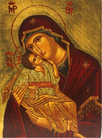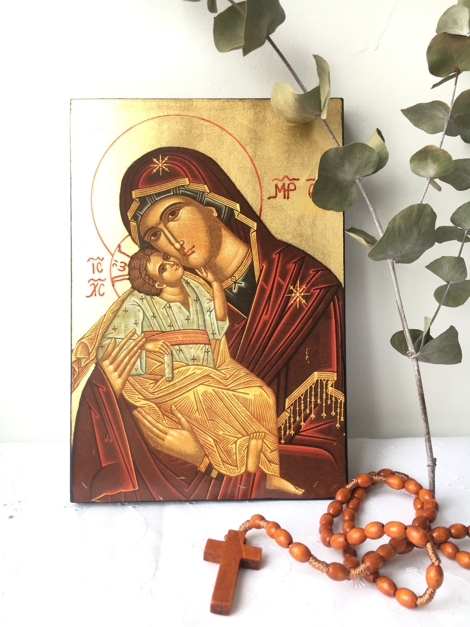 Cette icône byzantine est à l'effigie de la Vierge de Tendresse tenant dans ses bras l'Enfant Jésus. Elle a été fabriquée à la main de manière artisanale. Elle figure sur un petit canevas imprimé, qui a été doré avec des feuilles d'or. Cette icône est une reproduction imprimée, elle a été réalisée à partir d'oeuvres originales grecques. Les modèles peuvent varier, l'image peut ne pas être exactement la même. Ses dimensions sont les suivantes :