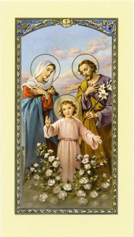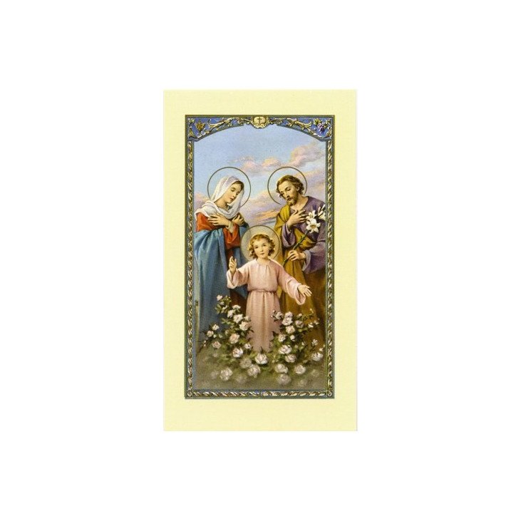 Cette image mesure 6,5 centimètres par 11,5 centimètres. Elles sont constituée de papier 220 grammes. Au recto, découvrez l'image de la Sainte Famille (l'image est entourée du dessin d'un cadre aux détails magnifiques). Au verso, vous pourrez lire la prière en rapport avec l'image. Appréciez l'expression des visages, les détails du dessin et l'atmosphère qui se dégage de ces images.