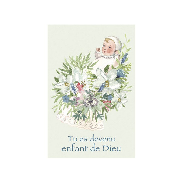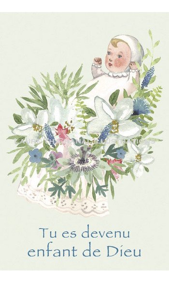 Vous souhaitez offrir un souvenir du baptême de votre enfant à ceux qui vous entourent ? Vos amis et votre famille ?Offrez cette ravissante image qui représente un enfant habillé entièrement de blanc, entouré de fleurs. Elle porte l'inscription : "Tu es devenu enfant de Dieu".