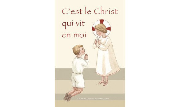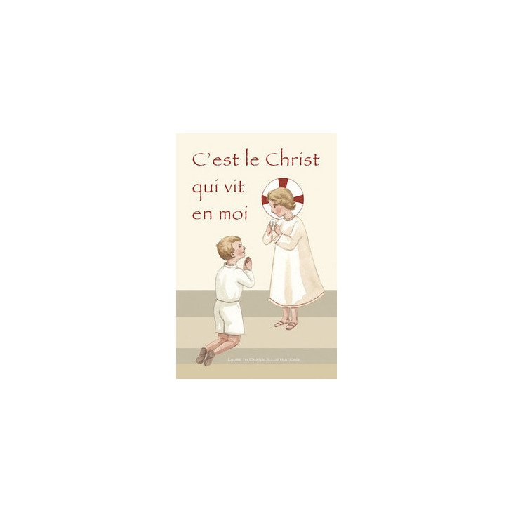 Cette image de première communion " C'est le Christ" représente un enfant en action de grâce devant Jésus représenté sous les traits d'un jeune garçon et porte l'inscription « C'est le Christ qui vit en moi ». Sur le thème de la première communion, elle fera un très joli souvenir de ce jour pour vos proches et vous-même.