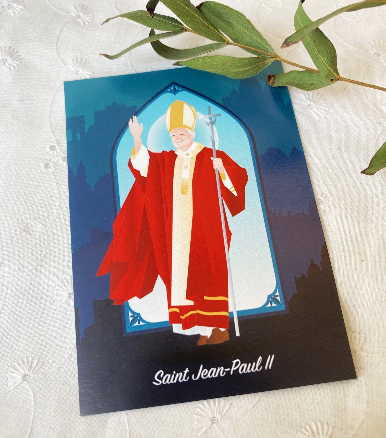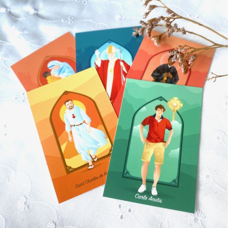 Vous trouverez dans cette collection d'images au graphisme résolument joyeux et coloré : Saint Jean-Paul II, Sainte Mère Teresa, mais également des images de Saint Charles de Foucauld, et nos derniers arrivés : Bienheureux Carlo Acutis et Sainte Joséphine Bakhita ! Ces jolies images au dessin innovant pourront être facilement emportées partout : glissées dans votre Bible, dans votre livre de chevet, dans votre portefeuille ou encore posées sur votre bureau ! Pensez à les offrir à vos proches également !