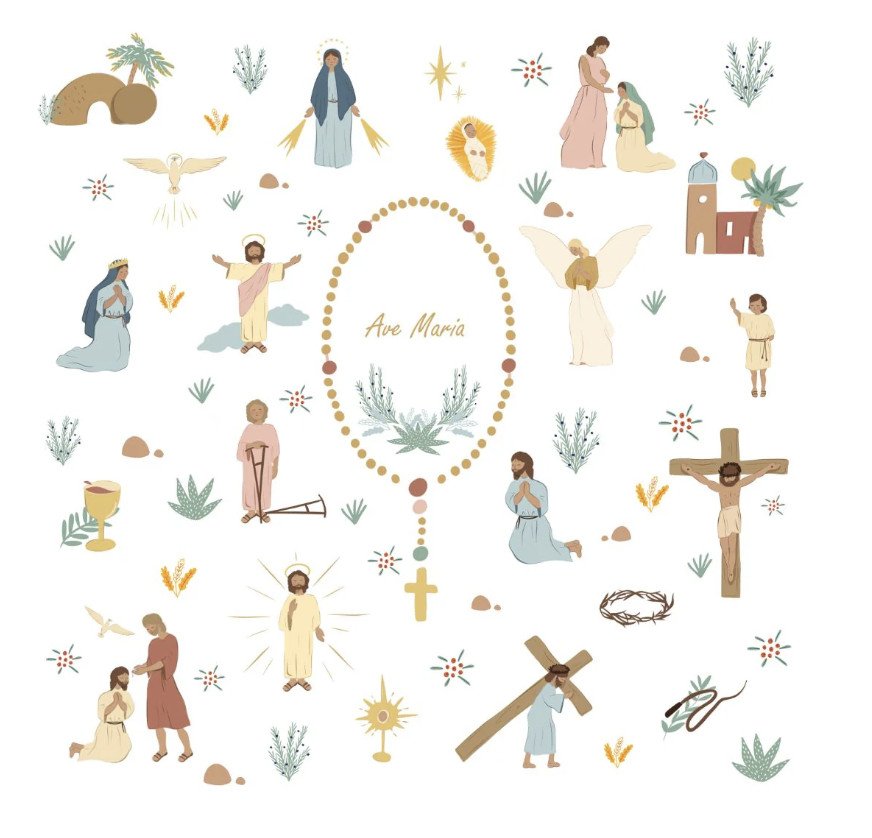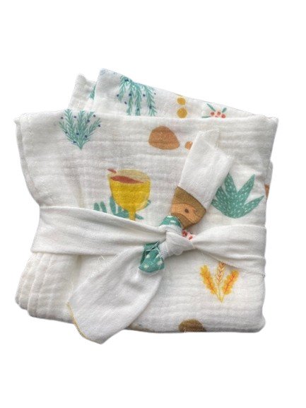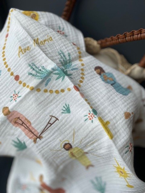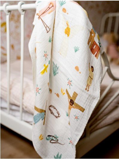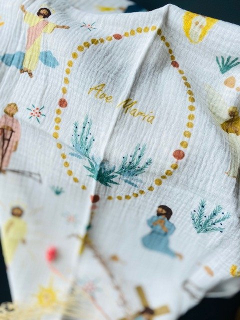 Ce lange d’éveil se transforme en doudou indispensable pour rassurer bébé, peut servir de tapis de jeu coloré et éducatif ou de décoration murale délicate dans une chambre d’enfant ! Comme un livre de bébé illustré, ce lange raconte par ses jolis dessins, les épisodes de la vie du Christ médités dans la prière du chapelet.
