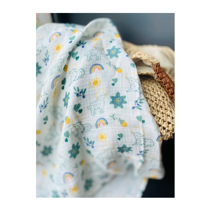 Ce joli lange 60 x 60 cm célèbre avec délicatesse le cœur de la foi chrétienne : la Résurrection du Christ. Conçu par Caladia Collections, il se pare de motifs évocateurs de Pâques : de tendres agneaux et un semis de fleurs de passiflores, fleur traditionnellement associée à la Passion du Christ.