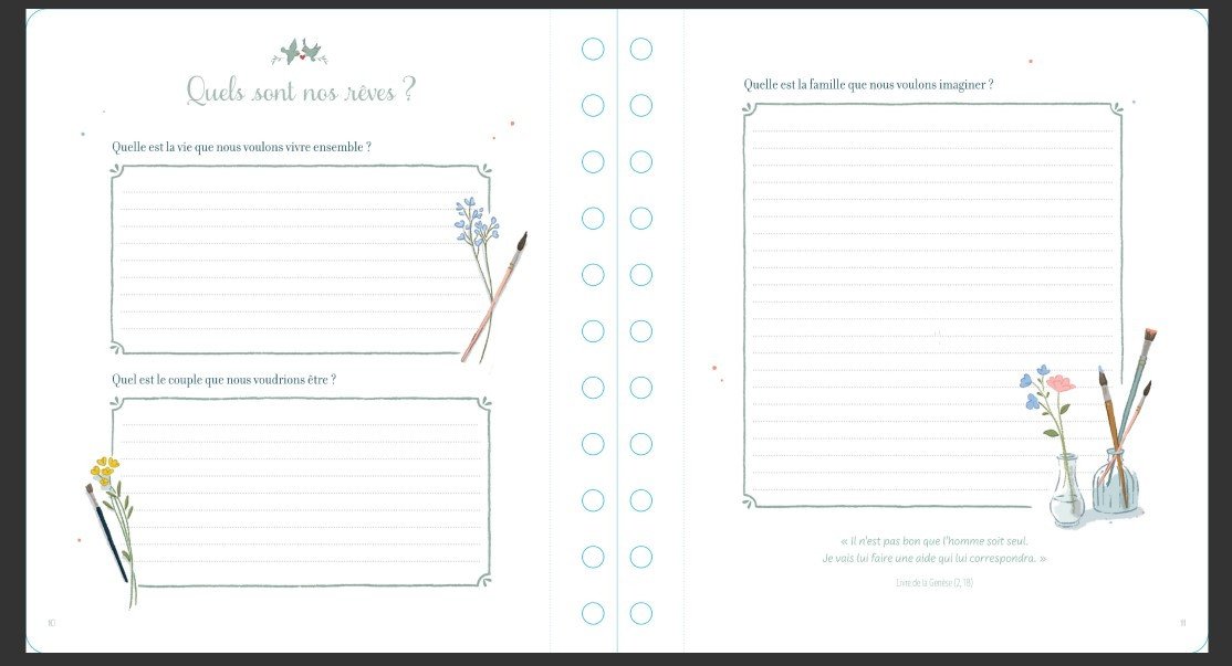 Pensé comme un compagnon de chemin, ce carnet peut être utilisé lors de la préparation au mariage, ou offert à l’issue de la célébration comme un précieux souvenir. Il trouvera naturellement sa place parmi les objets les plus chers d’un foyer chrétien.