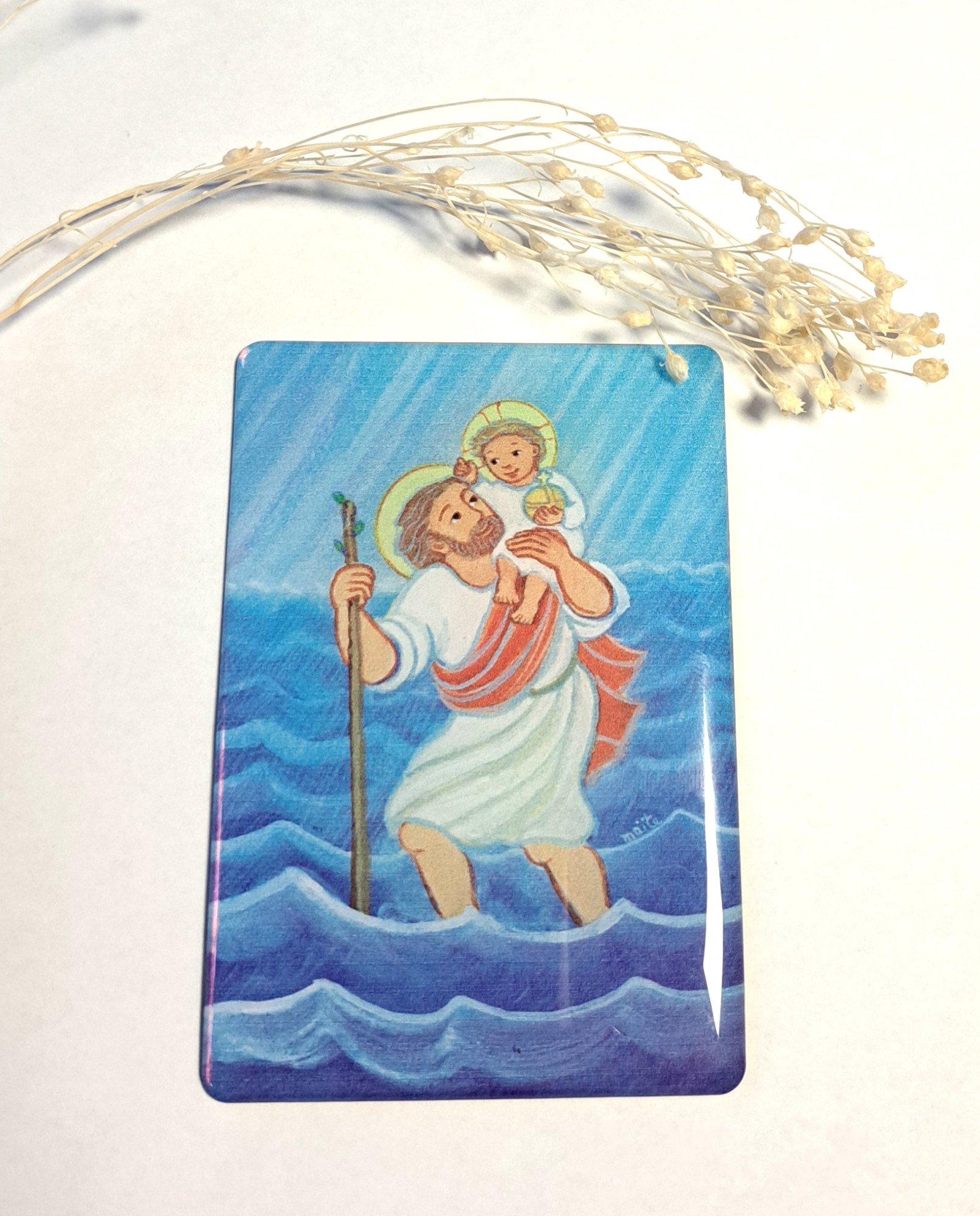 Voici un beau magnet représentant Saint Christophe, illustré par le dessin plein de sensibilité et de vie de Maïté Roche !