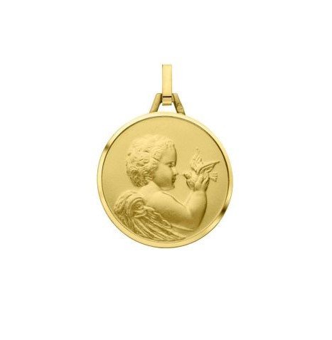 Parfaite comme médaille de baptême, elle séduit par son symbolisme universel : un petit angelot, représenté de profil, tenant délicatement une colombe prête à s’envoler. La colombe, signe de paix et d’espérance, mais aussi symbole de l'Esprit Saint, s’associe à l’image protectrice de l’ange gardien, veillant sur les enfants et les plus fragiles.