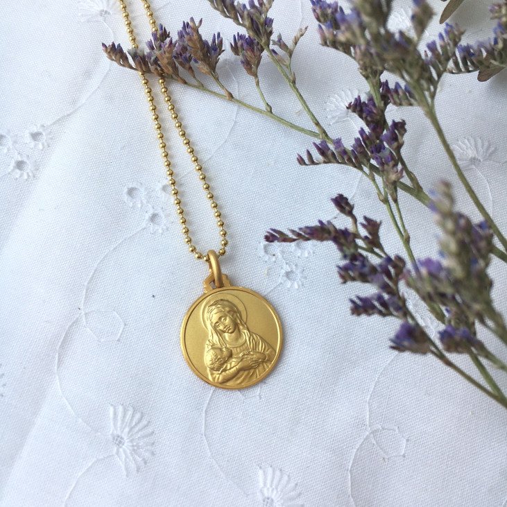 Médaille de la Vierge à l'Enfant - 18 mm - plaqué or Offrez ou offrez-vous cette très jolie médaille de la Vierge à l'enfant ornée d'un bord fin, en plaqué or. Cette médaille de la Vierge à l'enfant est pleine de douceur et de tendresse et conviendra parfaitement pour tous les âges, en cadeau de première communion, de profession de foi, de confirmation, ou même en cadeau d'anniversaire pourquoi pas ? Celui ou celle qui la recevra gardera ainsi un souvenir précieux de ce jour. Diamètre : 18 mm Plaqué or Bord fin Finition mate Quelle chaîne choisir pour une médaille 18 mm ? Vous pouvez porter cette jolie médaille de la Vierge à l'enfant sur une chaîne maille forçat en plaqué or 45 cm par exemple, ou sur une chaîne boules en plaqué or pour en faire un véritable bijoux, ou encore sur une chaîne maille forçat ou maille gourmette plus longue, comme une 60 cm.