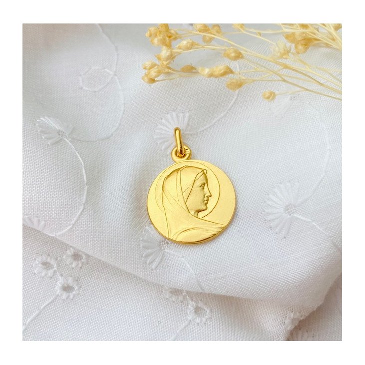 Cette médaille de la Vierge Marie, représentée de profil, est un modèle traditionnel en or 9 carats.