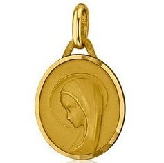 Voici une très jolie médaille ovale de la Vierge Marie en or 18 carats, au bord facetté.