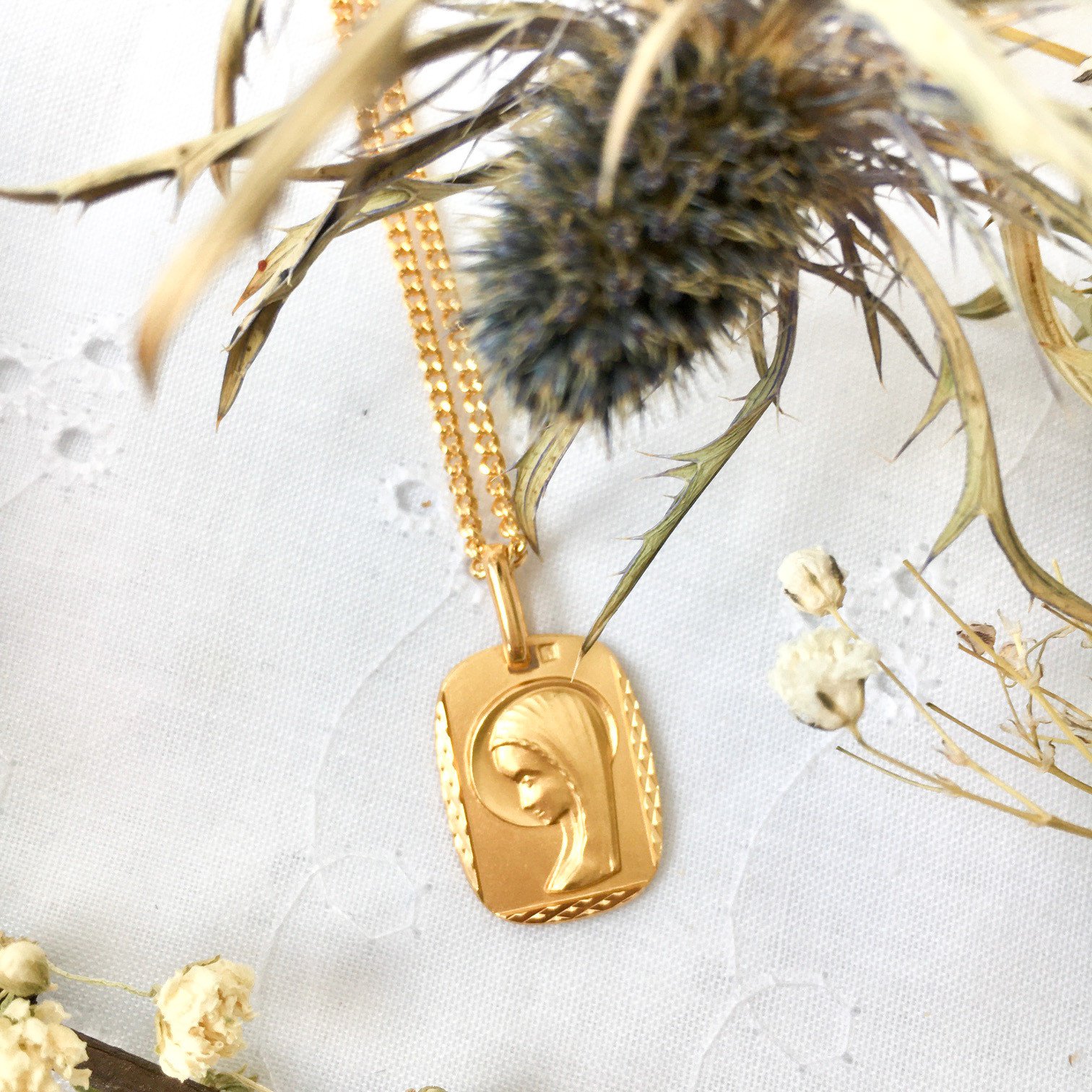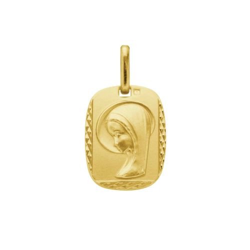 Choisissez une médaille de baptême originale avec cette très jolie médaille rectangulaire aux bords arrondis et facettés de la Sainte Vierge, en plaqué or.