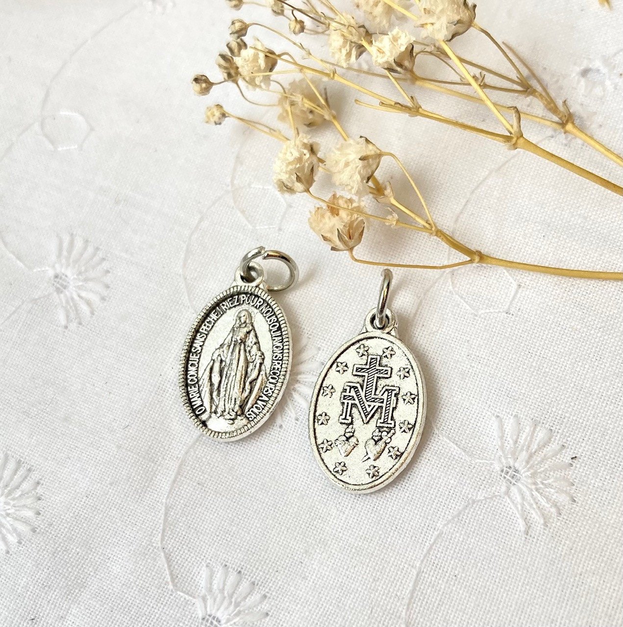 Médaille miraculeuse en métal argenté de 17 mm de hauteur, avec l'inscription " Oh Marie, conçue sans péché, priez pour nous qui avons recours à vous " en Français !