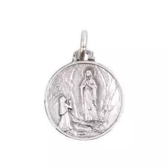 Admirez cette médaille en argent 925/1000 de Notre Dame de Lourdes dont la gravure représente l'apparition de la Vierge Marie dans la grotte Massabielle en 1858.