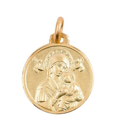 Adoptez et portez cette belle médaille Notre Dame du Perpétuel Secours en plaqué or, d'un diamètre de 18 mm.