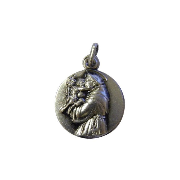 Médaille de Saint Antoine de Padoue, médaille ronde en métal argenté de 1.5 cm de diamètre.