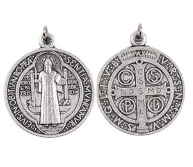 Belle médaille de saint Benoit en métal argenté, de 2 cm de diamètre. Cette médaille Saint Benoit est imprimée sur ses deux faces.