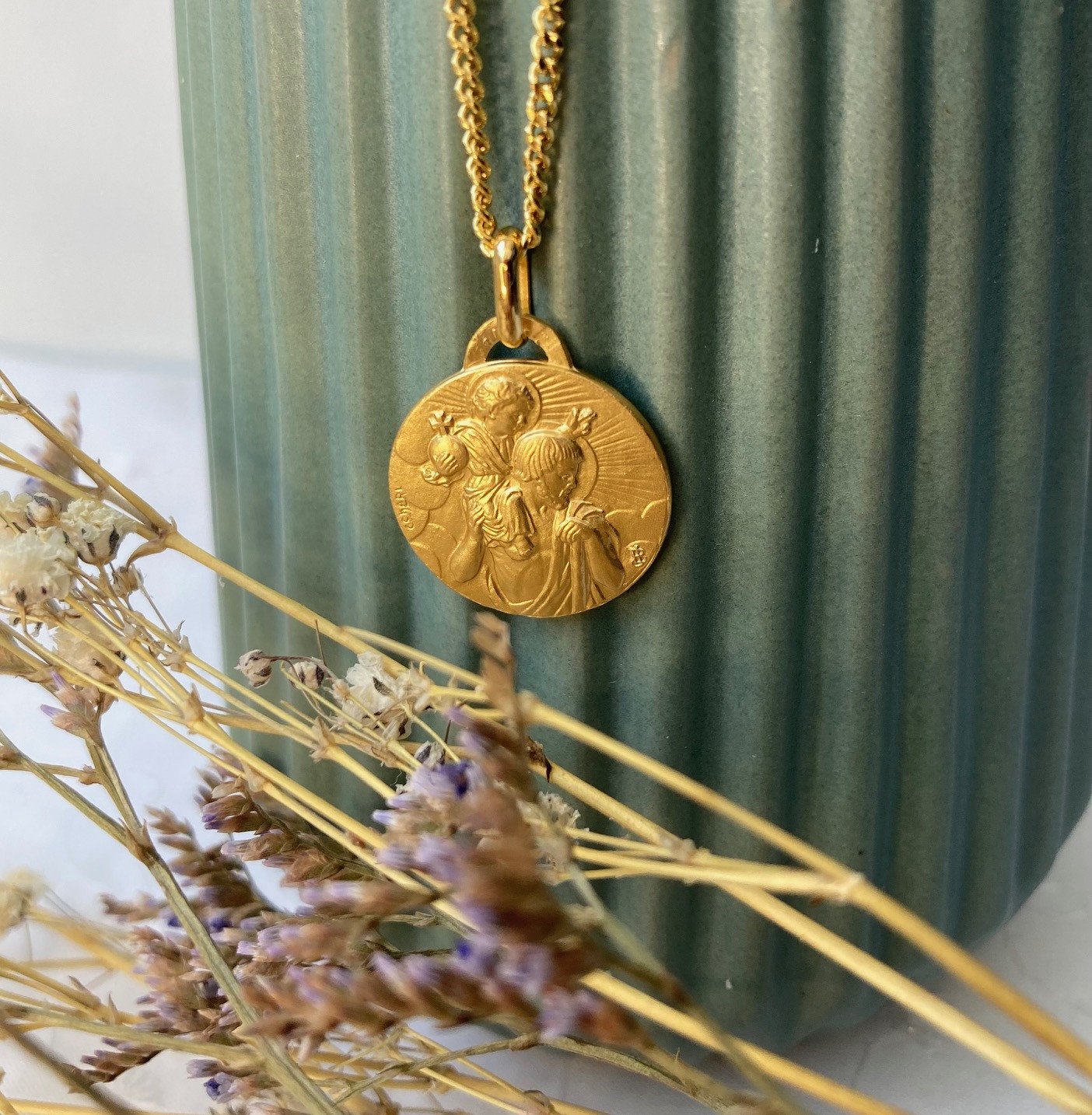 Portez ou offrez cette magnifique médaille en plaqué or de Saint Christophe en portrait, portant l'Enfant Jésus sur ses épaules !
