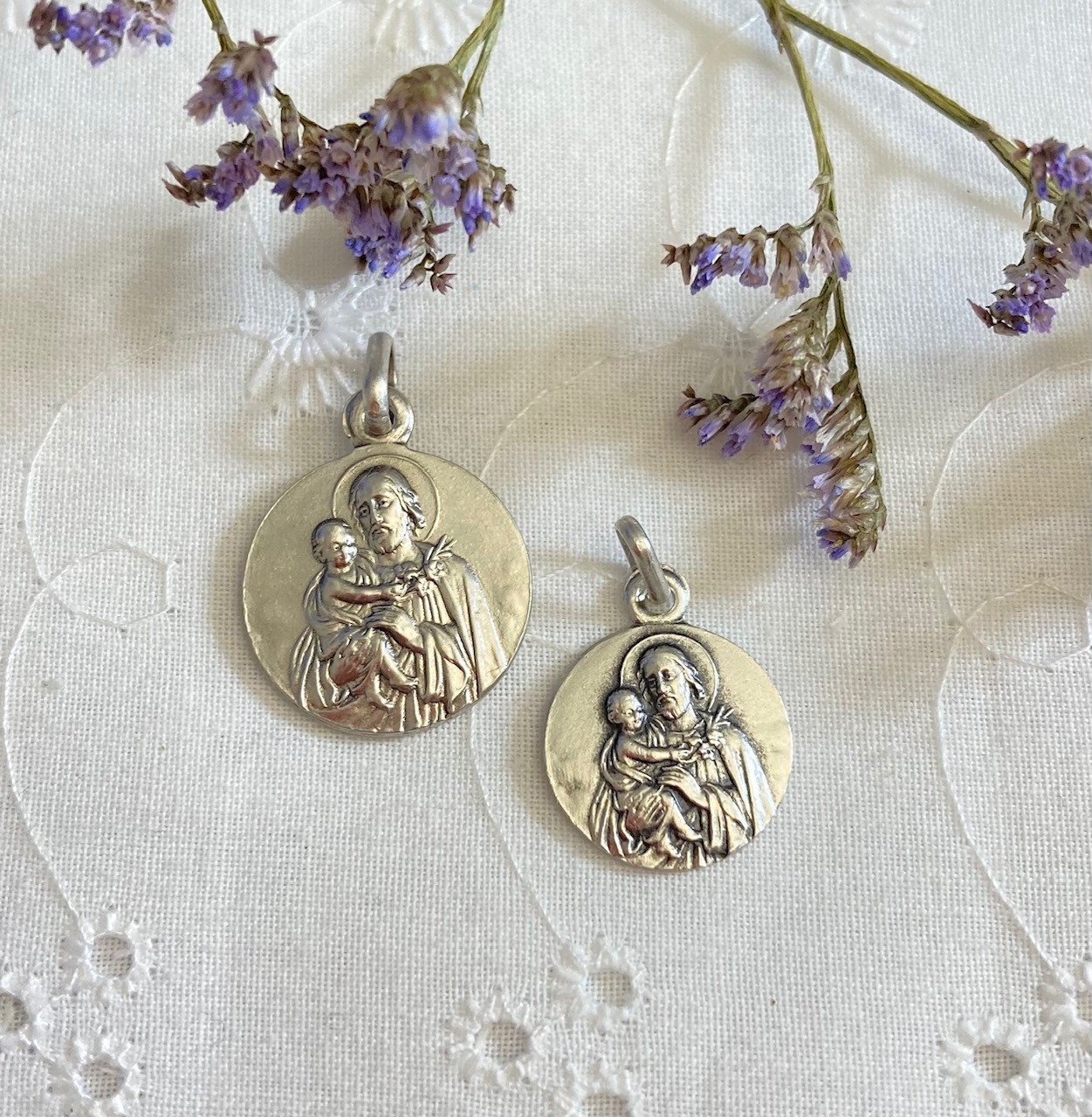 Très jolie médaille en argent 925/1000 de Saint Joseph, époux de la très Sainte Vierge Marie, Patron des travailleurs et de la famille. Sur la face de cette médaille, on peut admirer Joseph portant l'Enfant Jésus dans ses bras. Il tient également un lys dans sa main gauche, symbole de pureté et de chasteté.