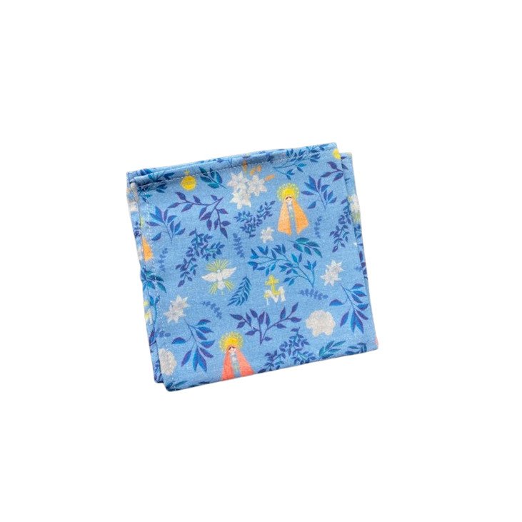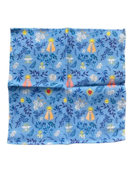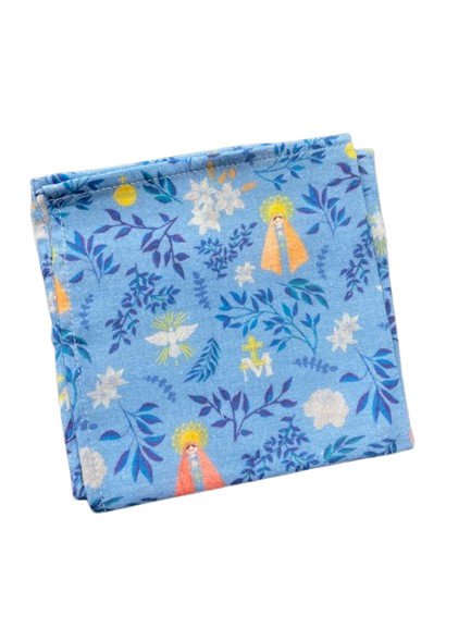 Objet du quotidien au tendre motif religieux, ce petit lange carré (30 x 30 cm) est orné de dessins délicats autour de la Vierge Marie Couronnée : lys blancs, cœurs sacrés, colombe de l’Esprit Saint, globe terrestre et l’initiale mariale entrelacée à la croix. Sur fond blanc et bleu azur, les couleurs douces et les lignes arrondies en font un objet à la fois tendre et riche de symbolique chrétienne.
