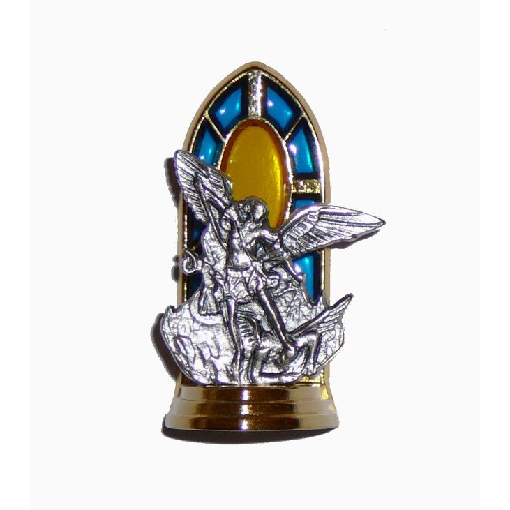 Petite statue en métal argenté de saint Michel Archange, sur socle doré avec vitrail coloré bleu et jaune.