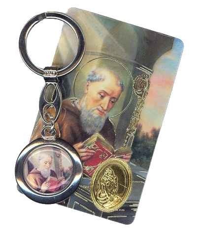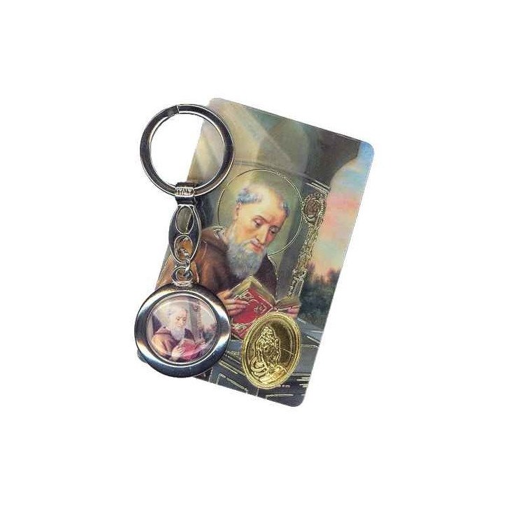 Porte-clés double face à l'effigie de Saint Benoît et de Saint Christophe, accompagné d'une carte de prière à Saint Benoit avec poinçon doré.